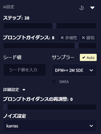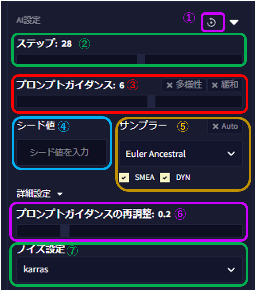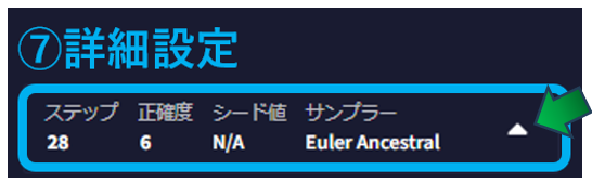 ⑦:詳細設定についてです。モデルと同様こちらによっても大きく生成される画像が変化します。画像の再現を取りたい場合は記録してしておきましょう