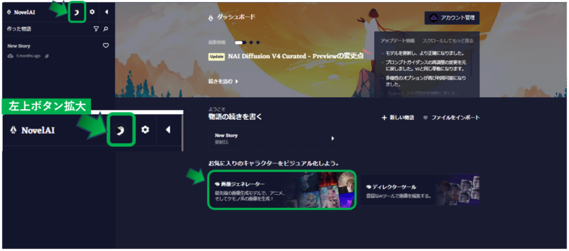 まずはログイン後、下のどちらかを押してください。右下の箇所をクリックした場合、直接画像生成のページに行くことができます。
