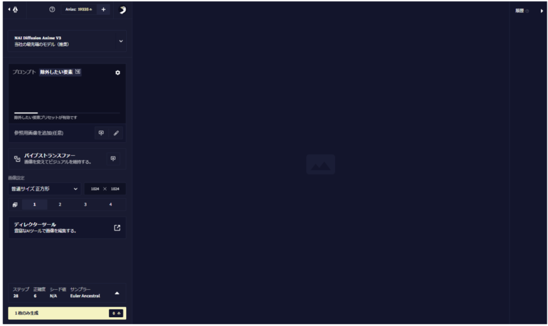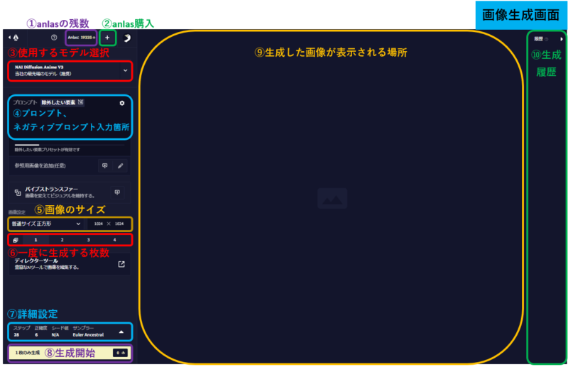 ⑤:画像サイズを選択できます。サブスクのOpus(25ドル/月)に入っていれば、1024×1024以下の画像を1枚ずつに限り、anlasを消費せず画像生成できます(2025年2月時点)
